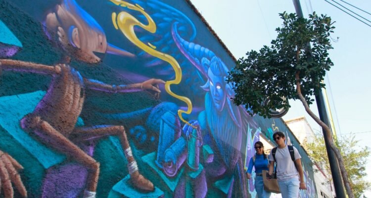 Artistas urbanos rinden un homenaje a la obra del cineasta mexicano Guillermo del Toro con un mural con los personajes de su cinta “Pinocchio”, nominada a mejor película de animación en los premios Óscar de este domingo.