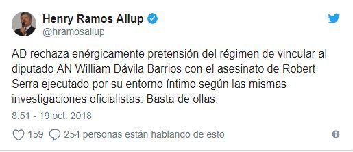 Por su parte, el Secretario General de Acción Democrática, Henry Ramos Allup, afirmó que esta organización “rechaza enérgicamente la pretensión del régimen de vincular al diputado AN William Dávila Barrios con el asesinato de Robert Serra ejecutado por su entorno íntimo“.