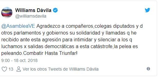 En mi calidad de presidente del Parlamento del Mercosur realizo un vehemente llamado al régimen dictatorial de Nicolás Maduro a garantizar la vida de nuestro compañero, el parlamentario Willian Dávila, el cual se encuentra en inminente peligro, debido a unas temerarias acusaciones realizadas por el vicepresidente Jorge Rodríguez, quien involucra al representante popular con el asesinato del diputado oficialista Robert Serra, acaecido el 01 de octubre de 2014 y lo incluye, además, en un equipo más extendido que procuró el supuesto magnicidio del jefe de Estado, en agosto del corriente año.