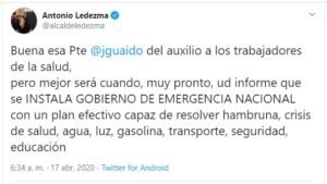 pero mejor será cuando, muy pronto, ud informe que se INSTALA GOBIERNO DE EMERGENCIA NACIONAL con un plan efectivo capaz de resolver hambruna, crisis de salud, agua, luz, gasolina, transporte, seguridad, educación— Antonio Ledezma (@alcaldeledezma) April 17, 2020