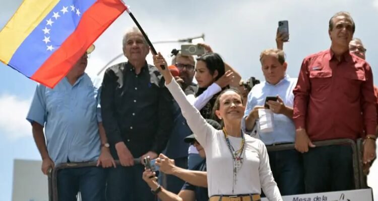 AFP La dirigente María Corina Machado y el candidato opositor, Edmundo González, acudieron a la protesta convocada en Caracas a bordo de un camión.