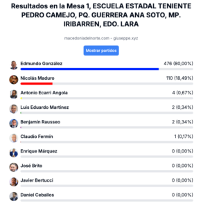Con dicha información, Gangi certificó que el comprobante correspondía a la mesa 1 de la Escuela Estadal Teniente Pedro Camejo, ubicada en la parroquia Ana Soto del municipio Iribarren. Allí el candidato unitario Edmundo González Urrutia arrasó con 476 votos frente a los 110 logrados por Nicolás Maduro. Gangi añadió además el acta de escrutinio íntegra que cuenta, además, con la firma de todos los testigos de mesa.