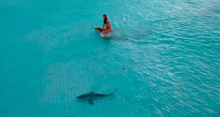 El video muestra cómo un tiburón de puntas negras se acercó a una mujer, su perro y otra persona que practicaba snorkel, mientras disfrutaban del agua.
