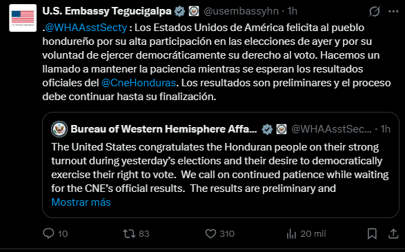 «Los Estados Unidos de América felicita al pueblo hondureño por su alta participación en las elecciones de ayer y por su voluntad de ejercer democráticamente su derecho al voto», escribió la Embajada estadounidense en X, este lunes 1 de diciembre, replicando una publicación de la Oficina de Asuntos del Hemisferio Occidental.