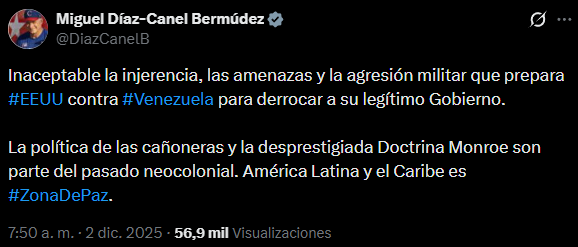 “Inaceptable la injerencia, las amenazas y la agresión militar que prepara EE.UU. contra Venezuela para derrocar a su legítimo Gobierno”, señaló Díaz-Canel en sus redes sociales.