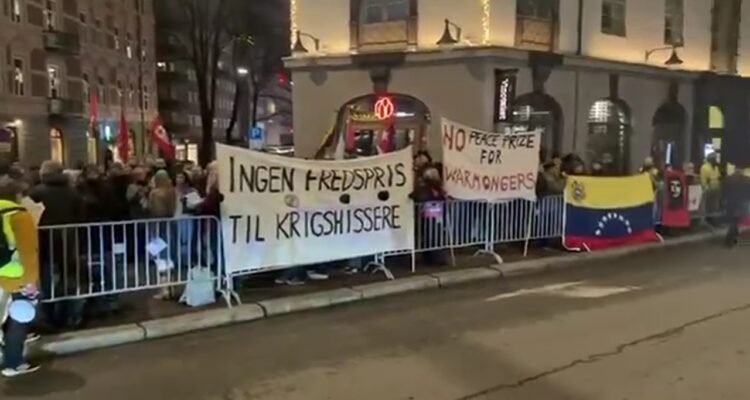 Bajo los lemas «Ningún premio de la paz para los belicistas» y «Estados Unidos, fuera de América Latina», los manifestantes se concentraron delante de la sede del Instituto Nobel de Oslo.