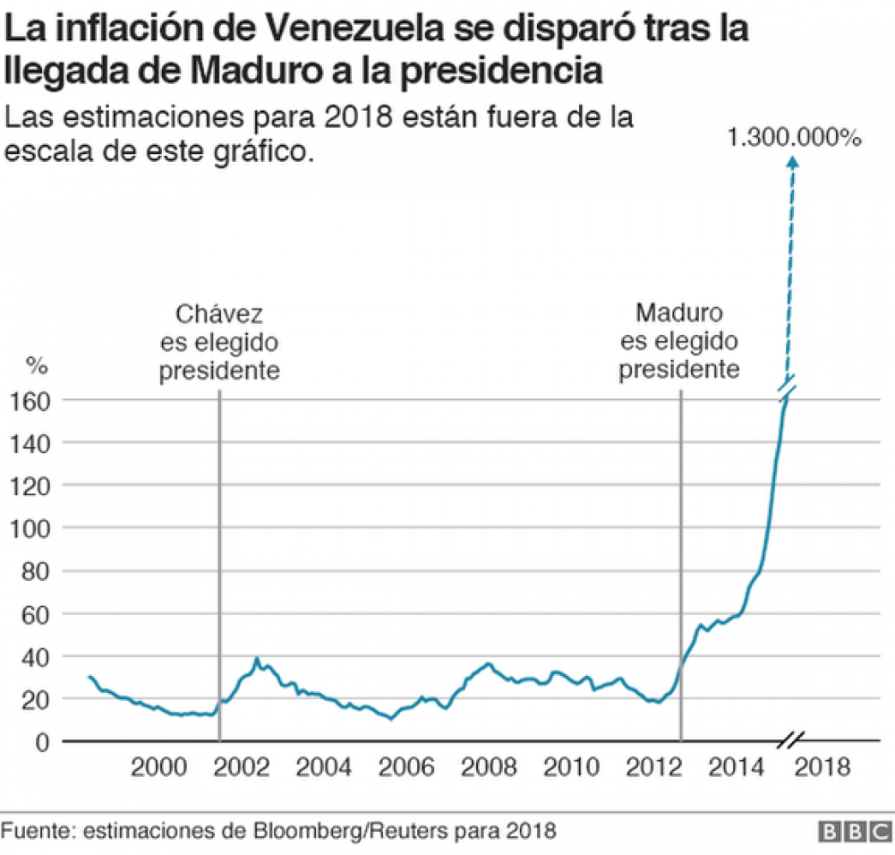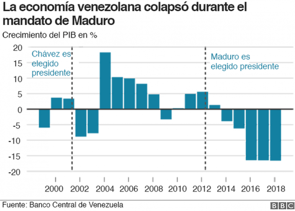 Nicolás Maduro tomó el poder después de la muerte de Hugo Chávez, en 2013. Desde entonces la economía venezolana ha estado en caída libre, con el Producto Interno Bruto decreciendo hasta más de un -15%. en el último par de años.