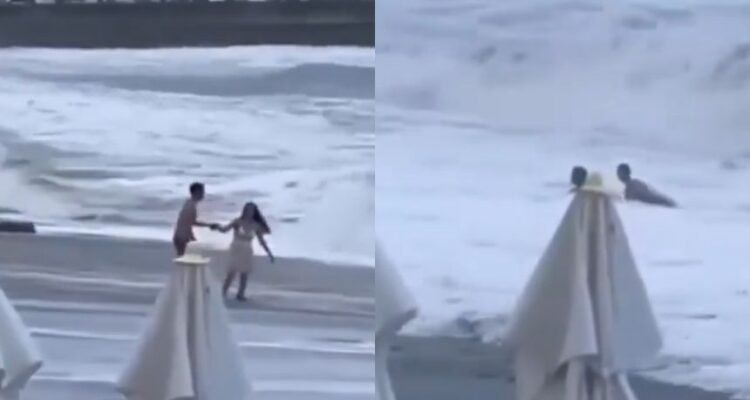 Aparentemente, el hombre no quería ingresar debido al fuerte oleaje, sin embargo, la mujer insistió y finalmente terminó entrando.