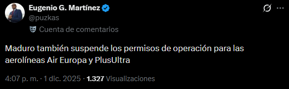 El régimen de Nicolás Maduro profundizó este lunes 1 de diciembre el aislamiento internacional de Venezuela al arremeter contra las pocas aerolíneas que mantenían operaciones en el país. Según reportó el periodista especializado Eugenio Martínez, el chavismo decidió suspender los permisos de operación de las compañías españolas Air Europa y Plus Ultra, dejando a los venezolanos prácticamente incomunicados con el viejo continente.