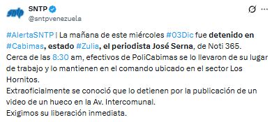 El Sindicato Nacional de Trabajadores de la Prensa (SNTP) denunció la detención arbitraria del periodista José Serna, del portal Noti 365, ocurrida la mañana de este miércoles, 3 de diciembre, en la ciudad de Cabimas, estado Zulia.