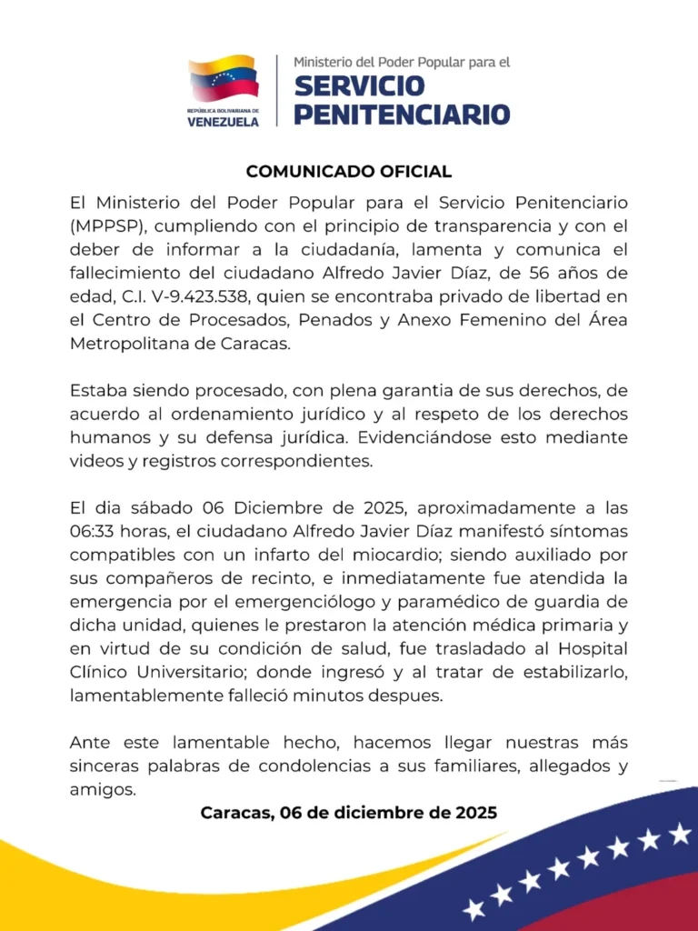 El Ministerio de Servicios Penitenciarios emitió un comunicado oficial este sábado 6 de diciembre confirmando la muerte del exgobernador del estado Nueva Esparta Alfredo Díaz, de 56 años de edad, quien se encontraba privado de libertad en El Helicoide, sede del Sebin en Caracas.