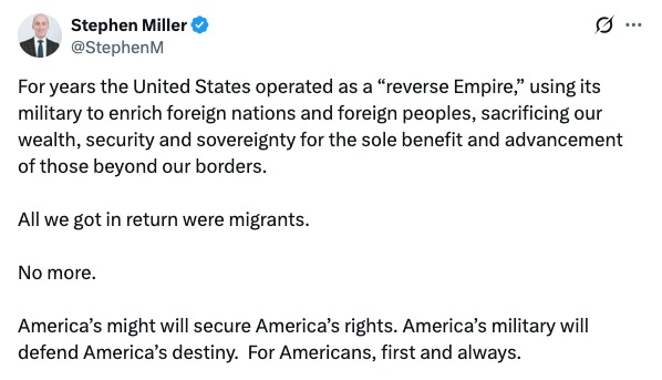 En su mensaje, Miller calificó las gestiones geopolíticas anteriores como un «Imperio al revés», argumentando que Washington utilizó durante años sus fuerzas armadas para enriquecer a naciones extranjeras a costa del sacrificio de la riqueza y seguridad nacional.