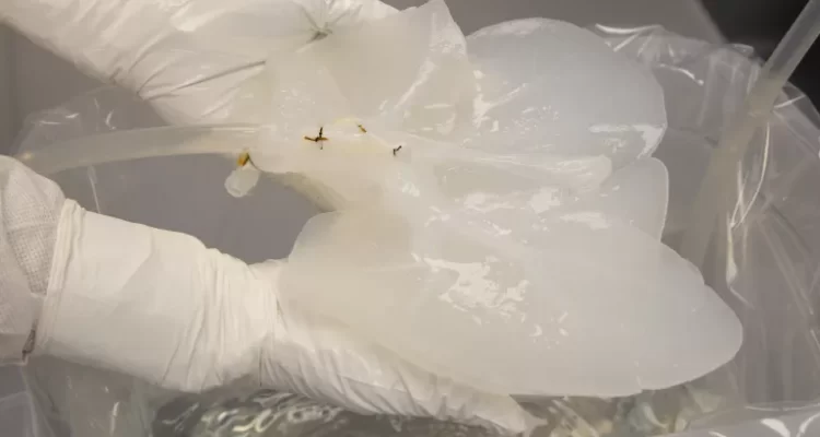 La forma fantasmal que flota en un frasco grande había tenido el sólido color rojizo marrón de un órgano sano sólo unas horas antes. Ahora es semitranslúcida, con tubos blancos parecidos a las ramas de un árbol.