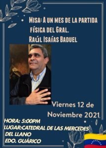 Al cumplirse 1 mes de la partida física del Gral. Raúl Isaías Baduel, nativo de Las Mercedes del Llano, su familia, amigos y allegados, realizarán una misa en su honor. En su tierra, por la que tanto luchó y anheló volver… Te invitamos a difundir y a acompañarnos. ¡GRACIAS!