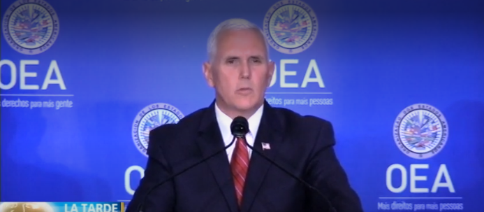 El vicepresidente de Estados Unidos, Mike Pence, participó este lunes ante la Organización de los Estados Americanos (OEA), sesión en la que pidió al presidente venezolano, Nicolás Maduro, suspender las elecciones presidenciales del 20 de mayo, a las que calificó de falsas.
