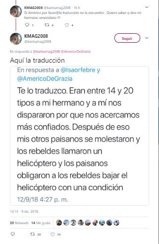 El testimonio -ofrecido en pemón- fue traducido en el hilo de tuits del parlamentario. “Eran 14 o 20 tipos y a mi hermano y a mí nos dispararon porque nos acercamos más confiados. Después de eso mis paisanos se molestaron y los rebeldes llamaron un helicóptero y los paisanos obligaron a los rebeldes a bajar del helicóptero con una condición”, relató Peñaloza.