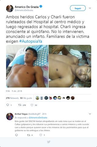 De Grazia apuntó, por su parte, que los indígenas fueron “ruleteados del Hospital al centro médico y luego regresados al hospital. Charli ingresa consciente al quirófano. No lo intervienen, anunciado un infarto. Familiares de la victima exigen autopsia”.