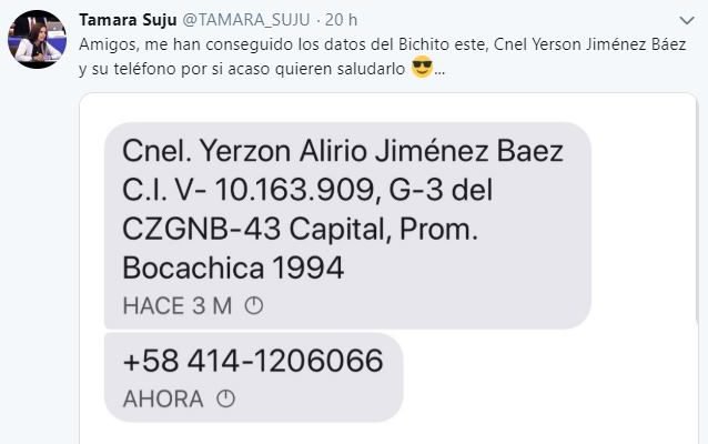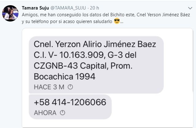 @tamara_suju: Amigos, me han conseguido los datos del Bichito este, Cnel Yerson Jiménez Báez y su teléfono por si acaso quieren saludarlo ?… WebMaster 24/01/2019 Venezuela Loading...