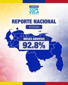 A esta hora, 9 am, el porcentaje de mesas abiertas a nivel nacional es de 92,8%.