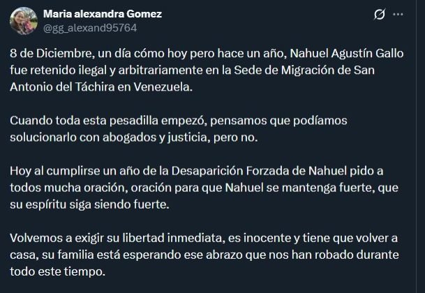 “Cuando toda esta pesadilla empezó, pensamos que podíamos solucionarlo con abogados y justicia, pero no. Hoy al cumplirse un año de la Desaparición Forzada de Nahuel pido a todos mucha oración, oración para que Nahuel se mantenga fuerte, que su espíritu siga siendo fuerte”, publicó Gómez a través de su cuenta en X.